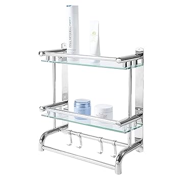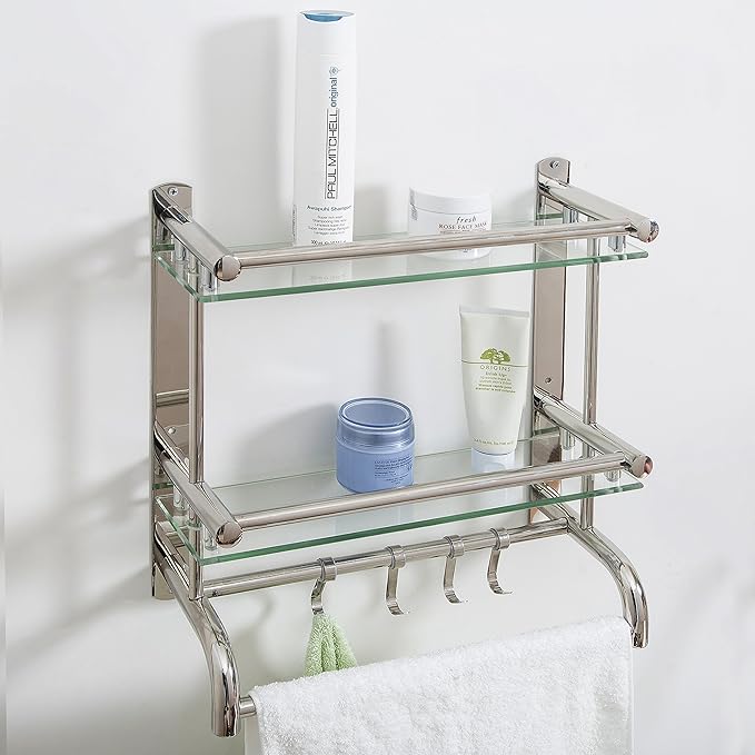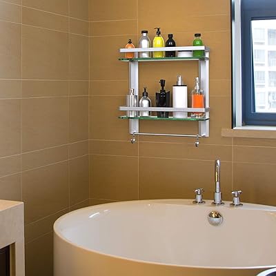 Vdomus tempered glass 2 tier shower shelf with rail and towel bar, rail protect your goods from falling down from the shelf easily, towel bar holds your favorite towels. Besy bathroom lavatory glass shelf with towel bar and rail, wall mount with screws,heavy duty sus304 stainless steel storage shelves, square halcent wall shelves wood storage shelves with towel bar, floating shelves rustic 2 tier bathroom shelf kitchen spice rack with hooks for. Товар 3 vdomus tempered glass bathroom shelf 2 tier shelf with towel bar wall mounted. The 5mm glass shelves are perfect storage for shampoo, soap, conditioner, or anything else that needs storing. The audoc bathroom shelves with rail give you two pine shelves that can be positioned anywhere on your bathroom wall.